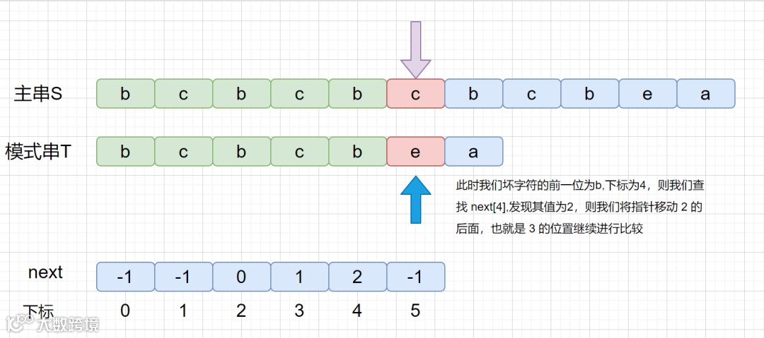next 数组存的咱们最长公共前后缀中,前缀的结尾字符下标。是不是感觉有点别扭,我们通过一个例子进行说明。