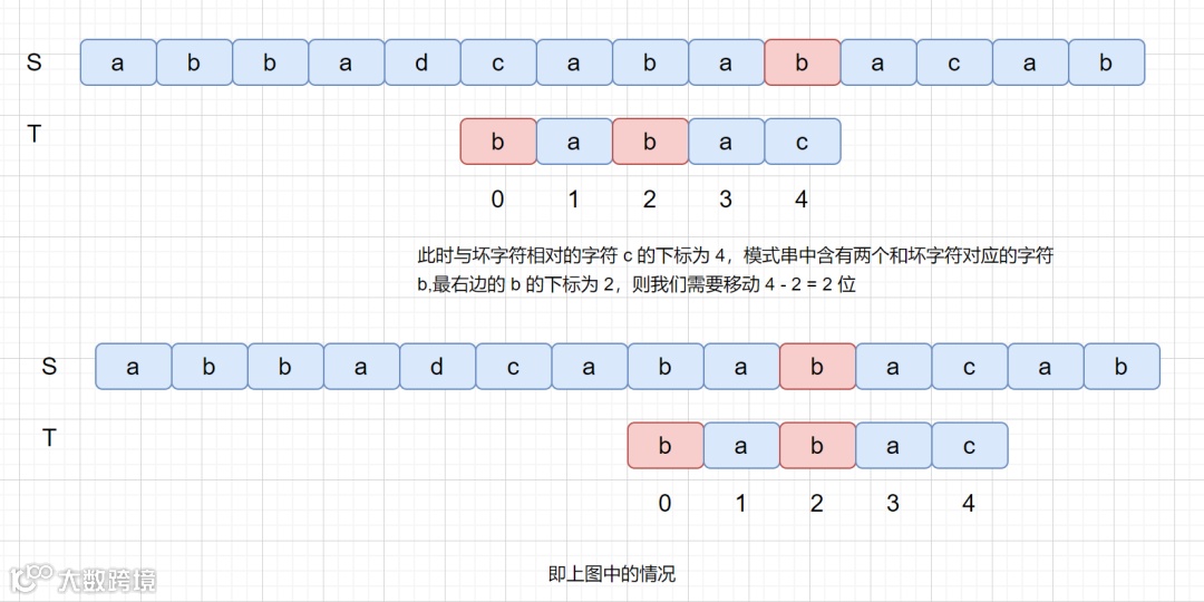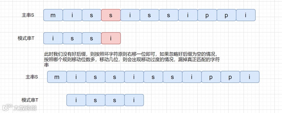 是不是感觉有点拗口,没关系,我们看下图,红色代表坏字符,绿色代表好后缀