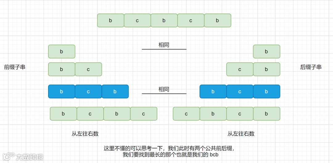 在上面的例子中我们提到了一个名词,最长公共前后缀,这个是什么意思呢?下面我们通过一个较简单的例子进行描述。