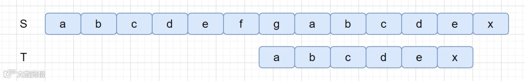 如上图所示,如果我们利用 BF 算法,遇到不匹配字符时,每次右移一位模式串,再重新从头进行匹配,我们观察一下,我们的模式串 abcdex 中每个字符都不一样,但是我们第一次进行字符串匹配时,abcde 都匹配成功,到 x 时失败,又因为模式串每位都不相同,所以我们不需要再每次右移一位,再重新比较,我们可以直接跳过某些步骤。如下图
