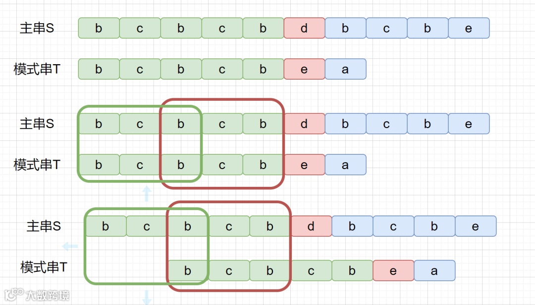 注:为了让读者更容易理解,我们将指针移动改成了模式串移动,两者相对与主串的移动是一致的,重新比较时都是从指针位置继续比较。