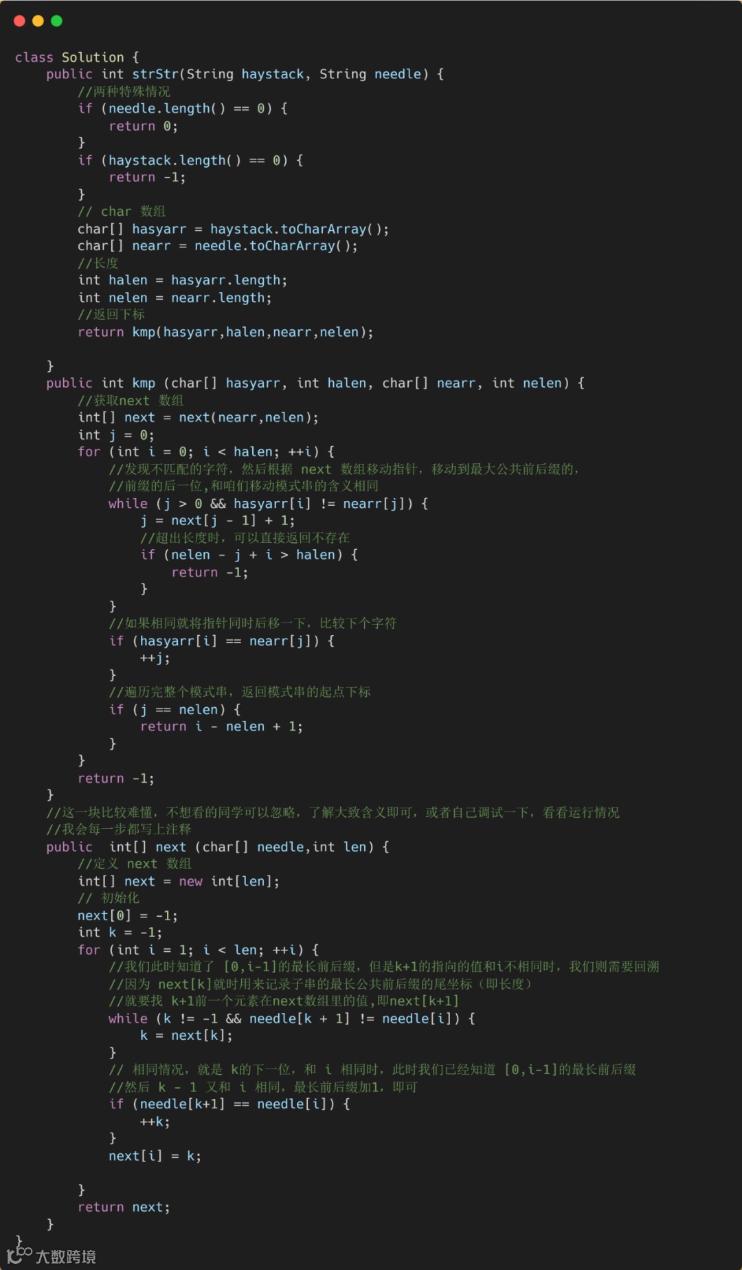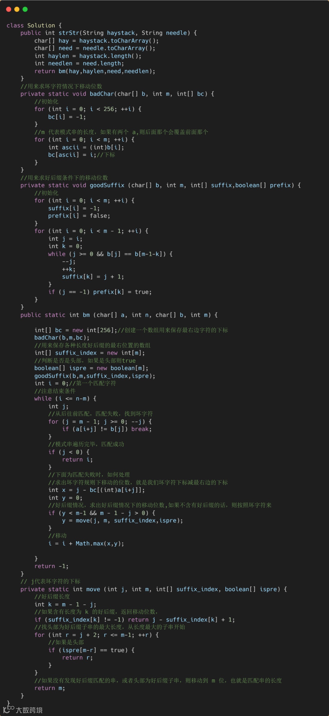 这破图画起来是真费劲啊。下面我们来看一下算法代码,代码有点长,我都标上了注释也在网站上 AC 了,如果各位感兴趣可以看一下,不感兴趣的话,理解坏字符和好后缀规则即可。可以直接跳到 KMP 部分