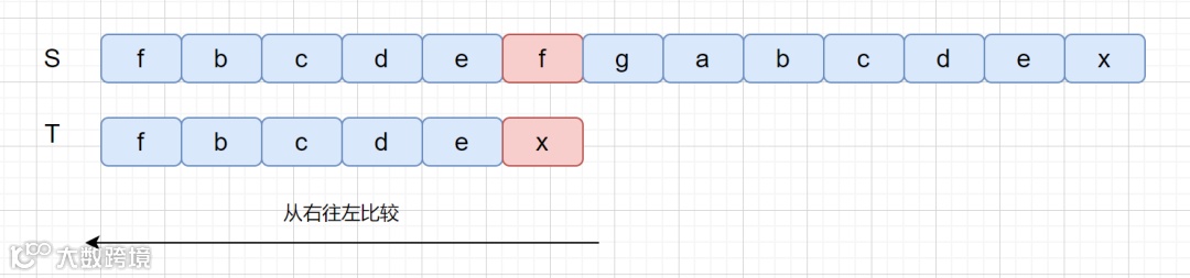 BM 算法是从后往前进行比较,此时我们发现比较的第一个字符就不匹配,我们将主串这个字符称之为坏字符,也就是 f ,我们发现坏字符之后,模式串 T 中查找是否含有该字符 f,我们发现并不存在 f,此时我们只需将模式串右移到坏字符的后面一位即可。如下图