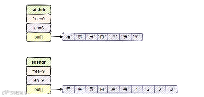 不过有个特殊的地方,在把“程序员内点事”的6个字节扩容到“程序员内点事123”9个字节后,发现free属性的值变成了扩容后字符串的总长度,这就涉及到下边要说的内存重分配策略了。