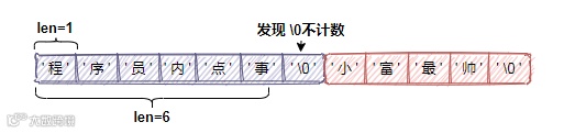 例如上图表示的是buf[]保存长度为6个字节的字符串,未使用的字节数free为0,但是眼尖的同学会发现这明明是7个字符,还有一个"\0"啊?