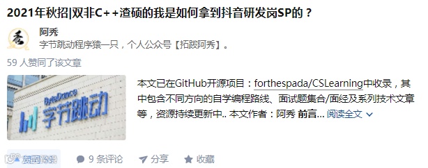 要从知乎说起了,我把自己的秋招总结上传到知乎上了,就是这篇文章「双非渣硕的秋招之路总结(已拿抖音研发岗SP)」
