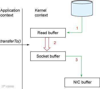 在此模型下,上下文切换的数量减少到一个。具体而言,transferTo()方法指示块设备通过 DMA 引擎将数据读取到读取缓冲区中。然后,将该缓冲区复制到另一个内核缓冲区以暂存到套接字。最后,套接字缓冲区通过 DMA 复制到 NIC 缓冲区。