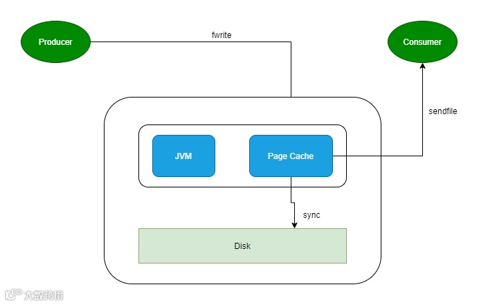 producer 生产消息到 Broker 时,Broker 会使用 pwrite() 系统调用【对应到 Java NIO 的 FileChannel.write() API】按偏移量写入数据,此时数据都会先写入page cache。consumer 消费消息时,Broker 使用 sendfile() 系统调用【对应 FileChannel.transferTo() API】,零拷贝地将数据从 page cache 传输到 broker 的 Socket buffer,再通过网络传输。