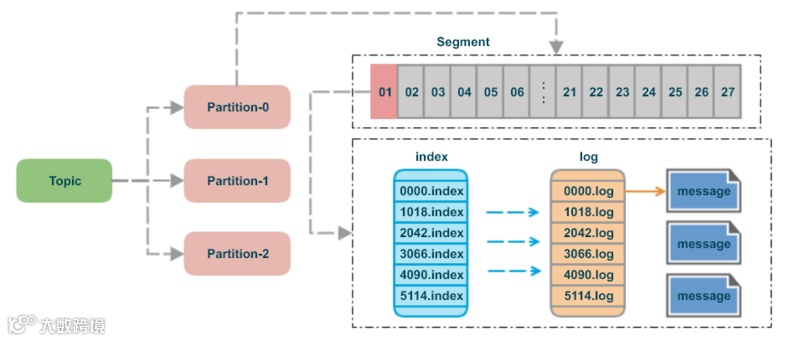 segment file 组成:由 2 大部分组成,分别为 index file 和 data file,此 2 个文件一一对应,成对出现,后缀”.index”和“.log”分别表示为 segment 索引文件、数据文件。 -