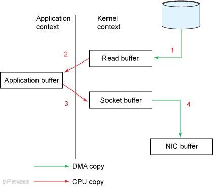 如图,如果采用传统的 IO 流程,先读取网络 IO,再写入磁盘 IO,实际需要将数据 Copy 四次。