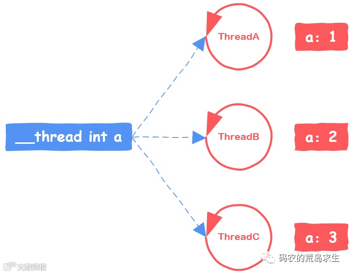 其实在上一篇文章中我们讲过,被__thread关键词修饰过的变量放在了线程私有存储中,Thread Local Storage,什么意思呢?