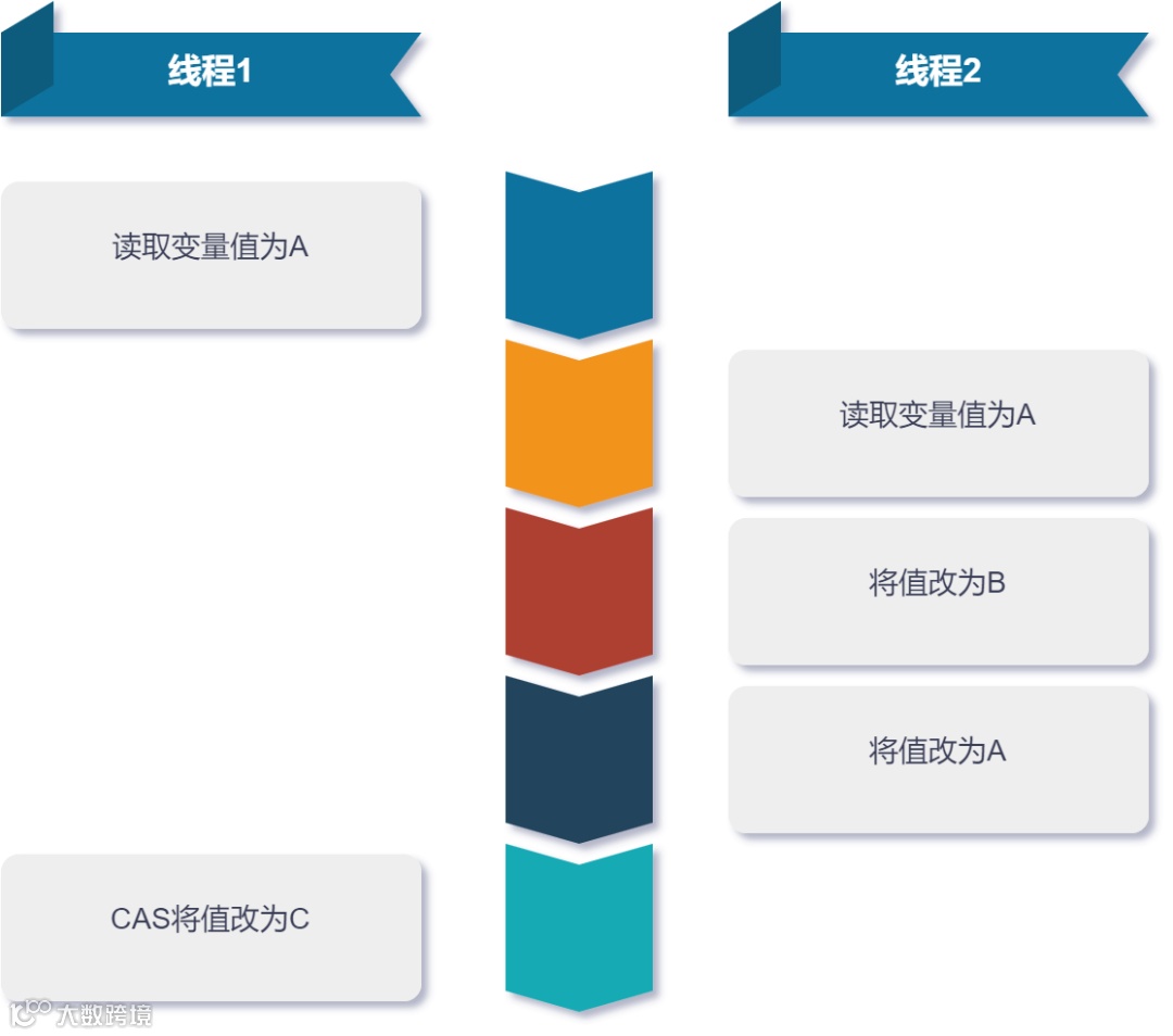 我们可以看到, CAS 算法是基于值来做比较的,如果当前有两个线程,一个线程将变量值从 A 改为 B ,再由 B 改回为 A ,当前线程开始执行 CAS 算法时,就很容易认为值没有变化,误认为读取数据到执行 CAS 算法的期间,没有线程修改过数据。