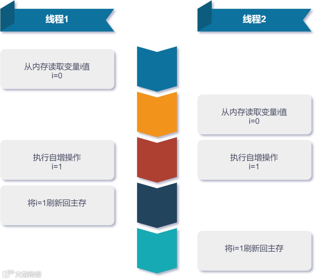 虽然两个线程都进行了 i++ 的操作,i 的值本应是 2,但是按上图的流程来说,i 的值就变为 1 了