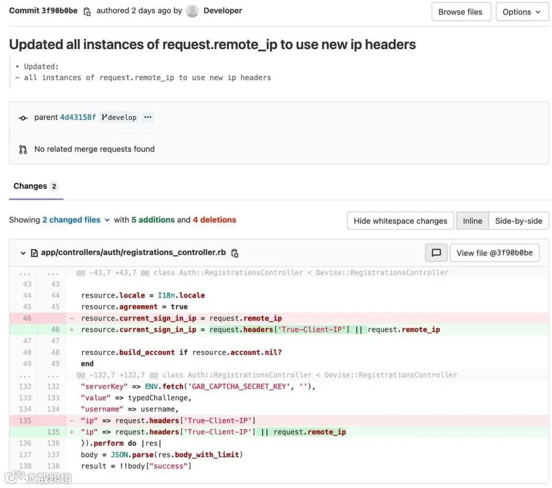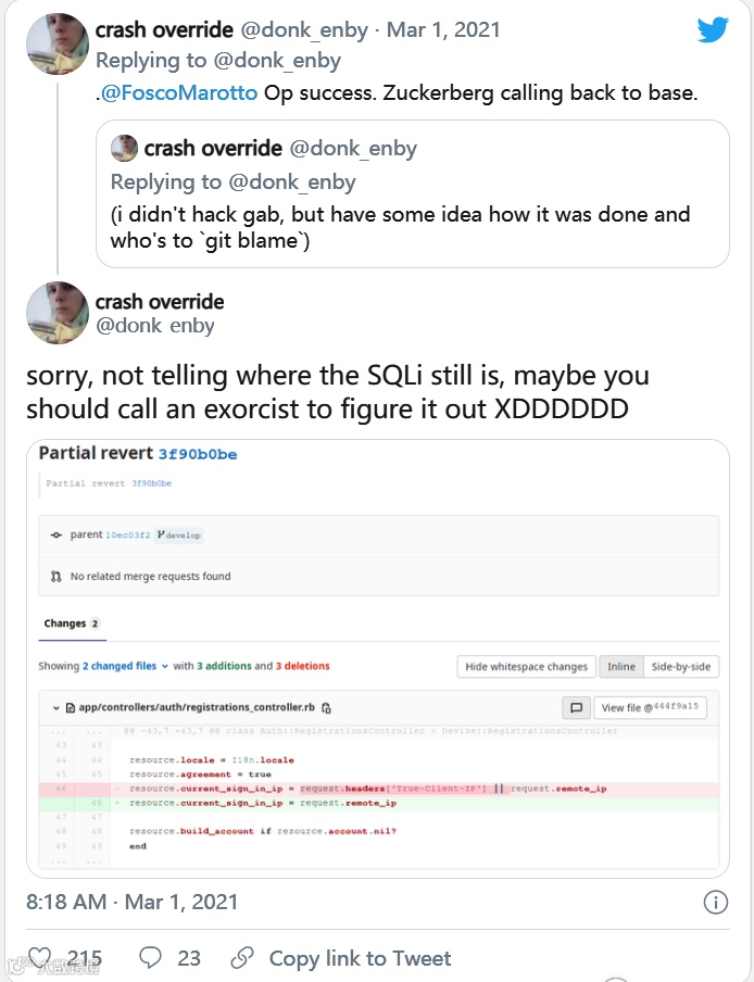 通过查看公司的 git commit 发现,导致关键漏洞的代码变更,是在 2 月份的某个时候从 Fosco Marotto 的账户上进行的,他是一名前 Facebook 软件工程师,11 月成为 Gab 的 CTO。周一,Gab 将此 git commit 从网站上删除,但网络上已有图片保存了关键代码。