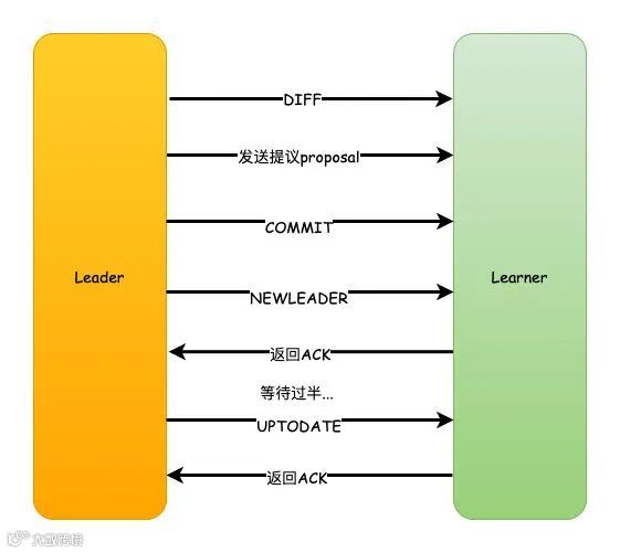接着等待集群中过半的Learner响应了ACK之后,就发送一个UPTODATE命令,Learner返回ACK,同步流程结束