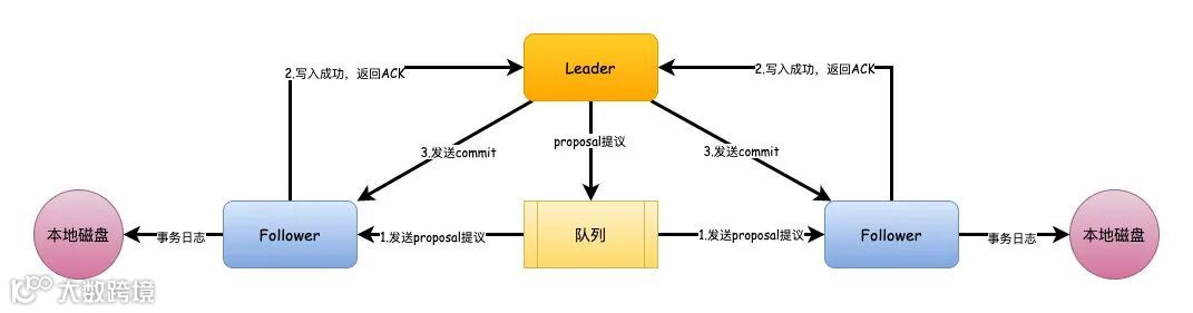 Leader在收到超过半数的Follower的ACK之后,即可认为数据写入成功,就会发送commit命令给Follower告诉他们可以提交proposal了