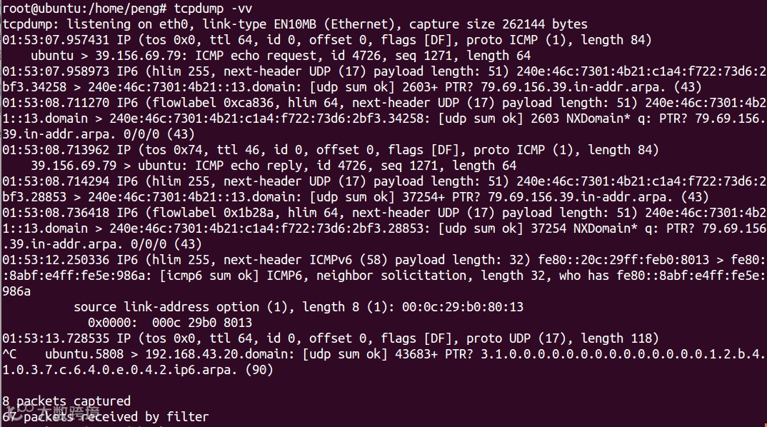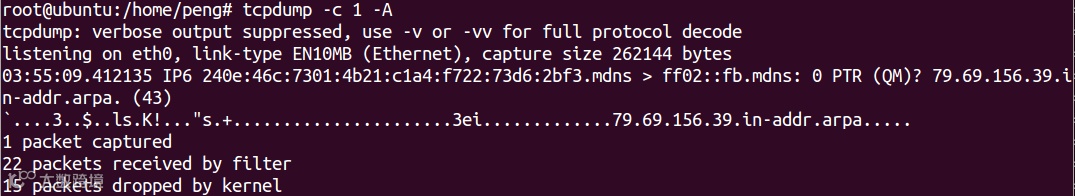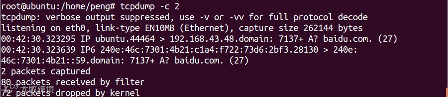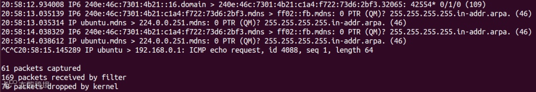 按下Ctrl+C会终止tcpdump命令。且会在结尾处生成统计信息。