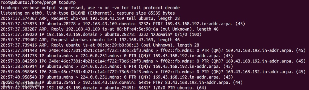 使用-n后,tcpdump会直接显示IP地址,不会显示域名(与netstat命令相似)。
