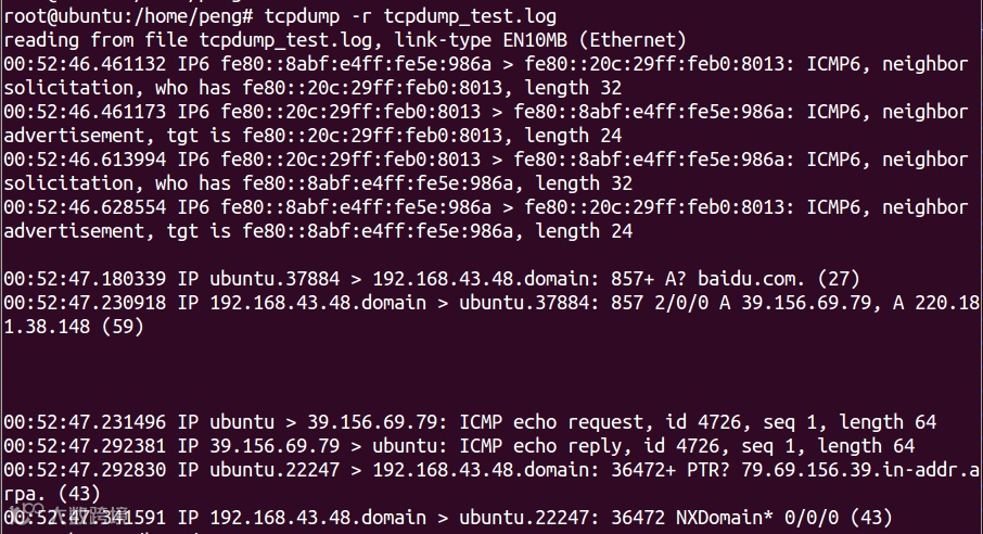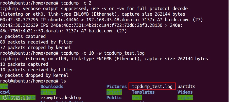 普通情况下,直接启动tcpdump将监视第一个网络接口上所有流过的数据包。