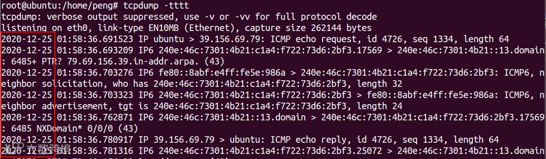 使用-tttt选项,抓包结果中将包含抓包日期: