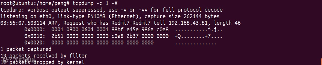 使用-X参数能16进制数与ASCII码共同显示数据包。