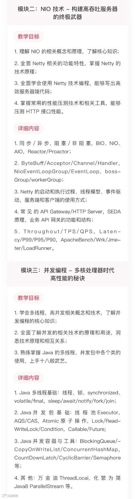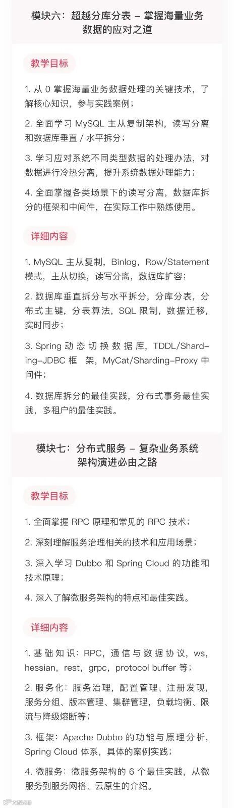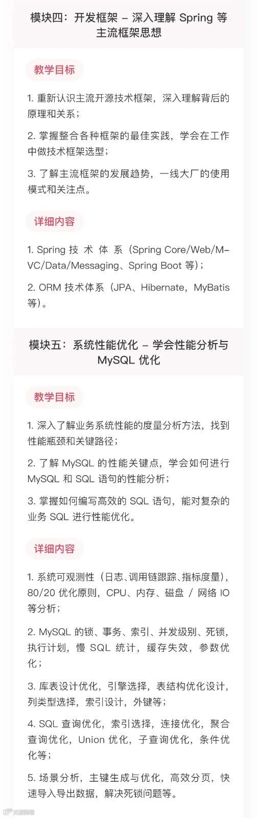 我将这些能力要求,按层次划分为 12 个教学模块,包括:JVM进阶、NIO技术、并发编程、开发框架、系统性能优化、超越分库分表、分布式服务、分布式缓存、分布式消息、分布式系统架构、业务系统重构、架构师修炼之道。