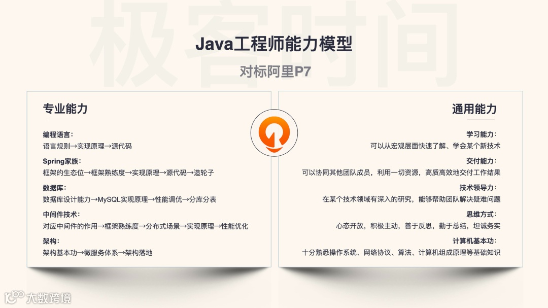 我在设计「Java 进阶训练营」时,研究了一线大厂对于 Java 架构师/技术专家(P7 水平)的能力要求模型,整体总结了 5 项专业能力、5 项通用能力,其中,每个专业能力项大致又分为 3 到 5 个等级。