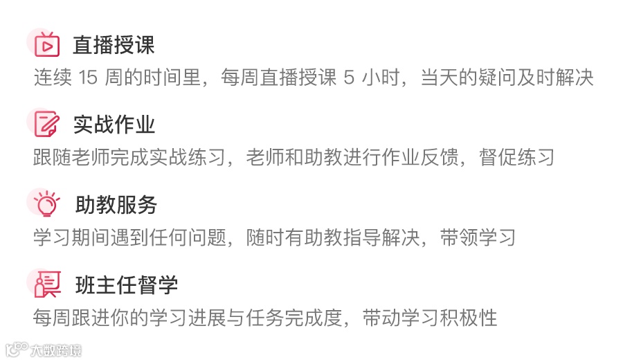 考虑到大家在学习过程中经常遇到的障碍,比如“遇到问题无法及时解决、拖延症、缺乏实战”等等,我在训练营中也专门设计了相关的学习服务: