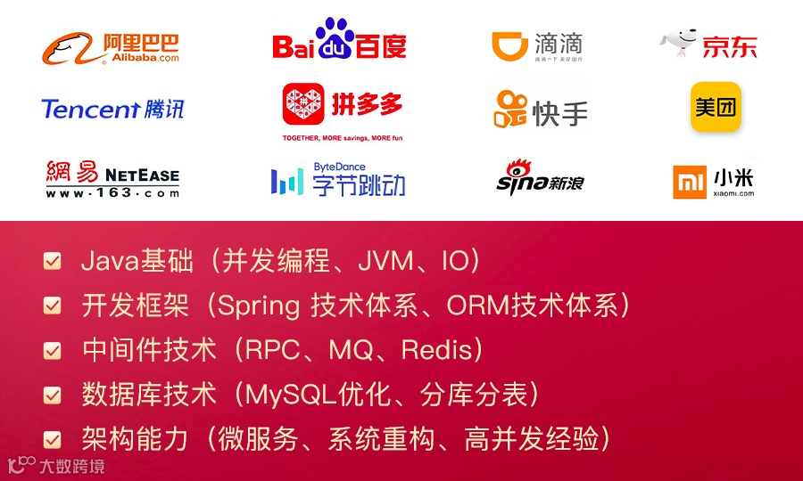 我研究了包括阿里巴巴、腾讯、百度、字节跳动、拼多多、美团、小米、网易、京东、快手、滴滴、新浪等公司的招聘要求,发现大家对于高级 Java 工程师、资深 Java 开发工程师、Java 技术专家、Java 架构师等高级岗位的能力要求基本都不超出以下几个点: