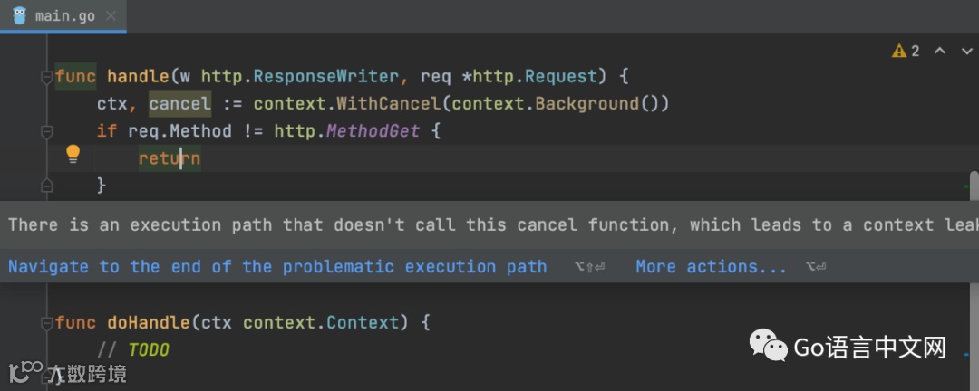 context.CancelFunc(不称为代码检查)报告了 context 取消的潜在不安全使用。当 context 返回的 “cancel” 函数未在所有执行路径上调用时,此功能特别有用。