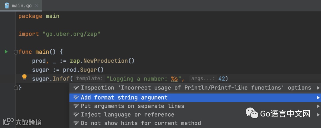 不正确使用类似 Println/Printf 的函数,GoLand 会有警告,之前只对标准库起作用,现在支持 github.com/pkg/errors, github.com/sirupsen/logrus 和 go.uber.org/zap 包。