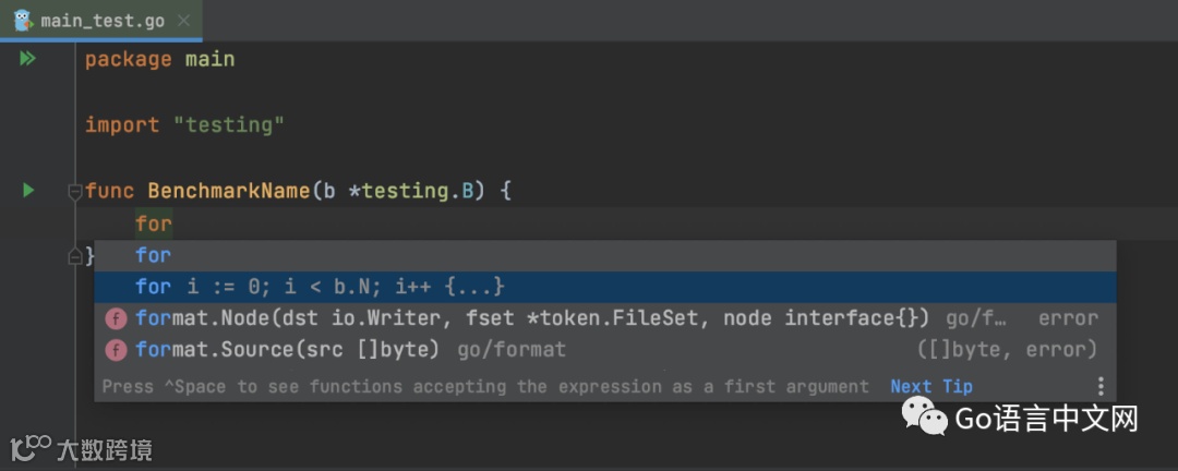 当您在基准测试中输入 for 时,IDE 建议使用 b.N 的 for 循环来完成它。