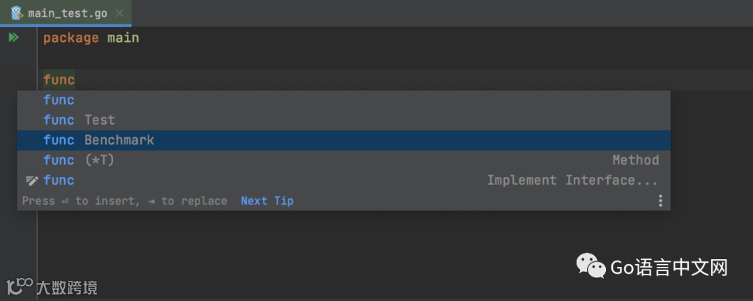 在测试文件中键入 func 时,默认情况下,GoLand 会提示出 bench 和 test 函数模板。