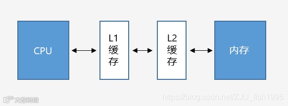 引入L1和L2缓存后,CPU和内存之间的将无法进行直接的数据交互,而是需要经过两级缓存(目前也已出现L3缓存)。