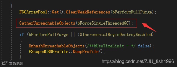 ue4的垃圾回收代码实现位于GarbageCollection.cpp中的CollectGarbage函数中。这一函数会在游戏线程中被反复调用,要么在一些情况下手动调用,要么在游戏循环Tick()中满足条件时自动调用。