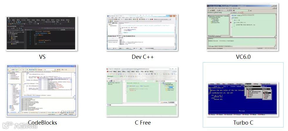 学编程语言只有书不行,你必须得敲代码吧,那编译软件呢?我们找来了6款编译软件,它们分别是:VS,DevC++,VC++,CodeBlocks,C-Free,Turbo C。关于它们的特点网上介绍很多了,我们就不赘述了。讲真,入门和基础阶段你用哪个无所谓,还是选自己喜欢的,不过对于初学者我们推荐Dev C++。
