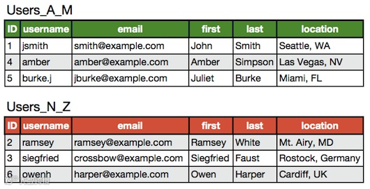 实际情况中往往会是垂直拆分和水平拆分的结合,即将Users_A_M和Users_N_Z再拆成Users和UserExtras,这样一共四张表
