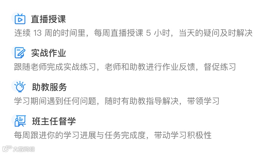 考虑到大家在学习过程中经常遇到的障碍,比如“遇到问题无法及时解决、拖延症、缺乏实战”等等,毛剑在训练营中也专门设计了相关的学习服务: