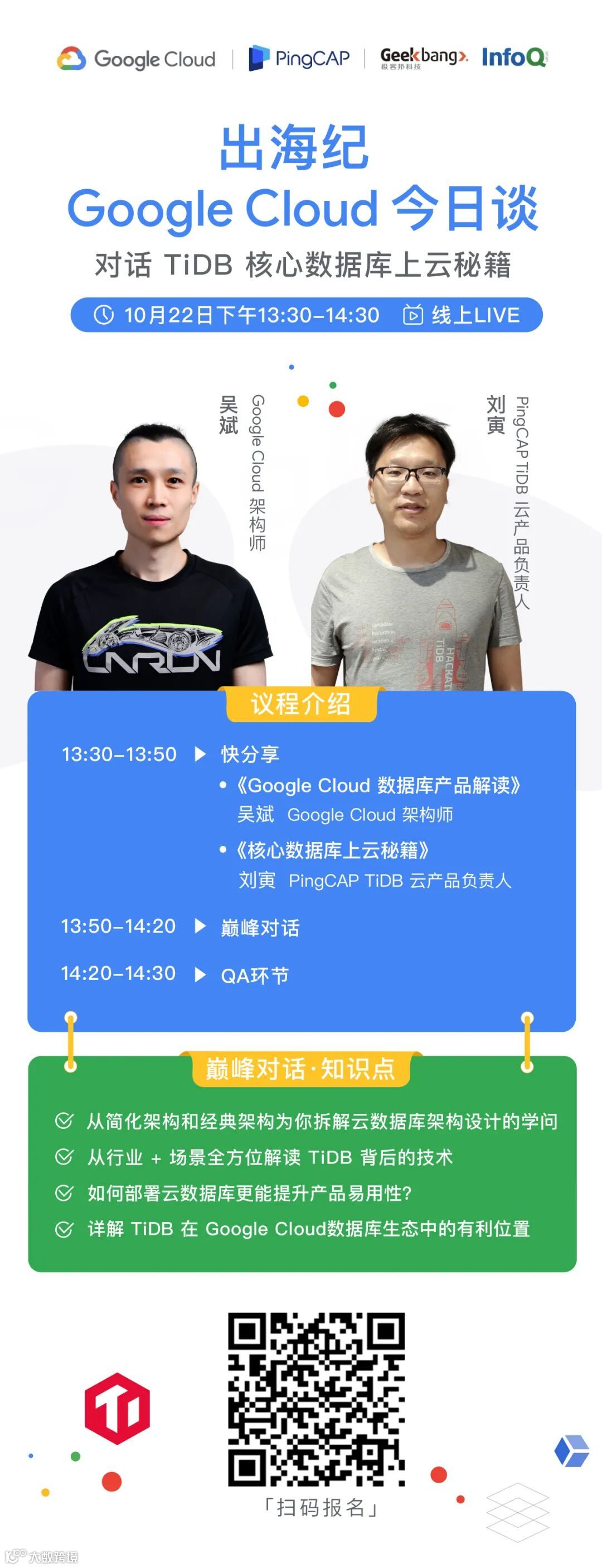 10 月 22 日,这里有一场线上对话为你答疑解惑!围观「出海纪 | Google Cloud 今日谈」系列活动第二期:对话 TiDB 核心数据库上云秘籍,你将看到来自 Google Cloud 的架构师吴斌和 PingCAP TiDB 云产品负责人刘寅通过对话的方式来分享 TiDB 开源及架构演进以及 Google Cloud 对于数据库上云的技术赋能。