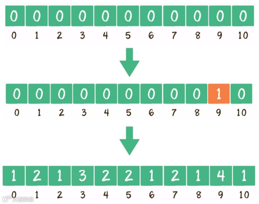计数排序不是基于比较的排序算法,其核心在于将输入的数据值转化为键存储在额外开辟的数组空间中。作为一种线性时间复杂度的排序,计数排序要求输入的数据必须是有确定范围的整数。