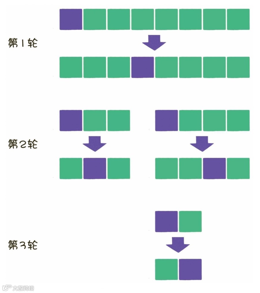 比较相邻的元素。如果第一个比第二个大,就交换它们两个。