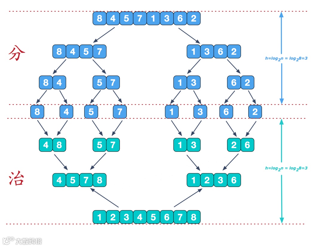 归并排序是建立在归并操作上的一种有效的排序算法。该算法是采用分治法的一个非常典型的应用。递归的把当前序列分割成两半(分割),在保持元素顺序的同时将上一步得到的子序列集成到一起(归并),最终形成一个有序数列。