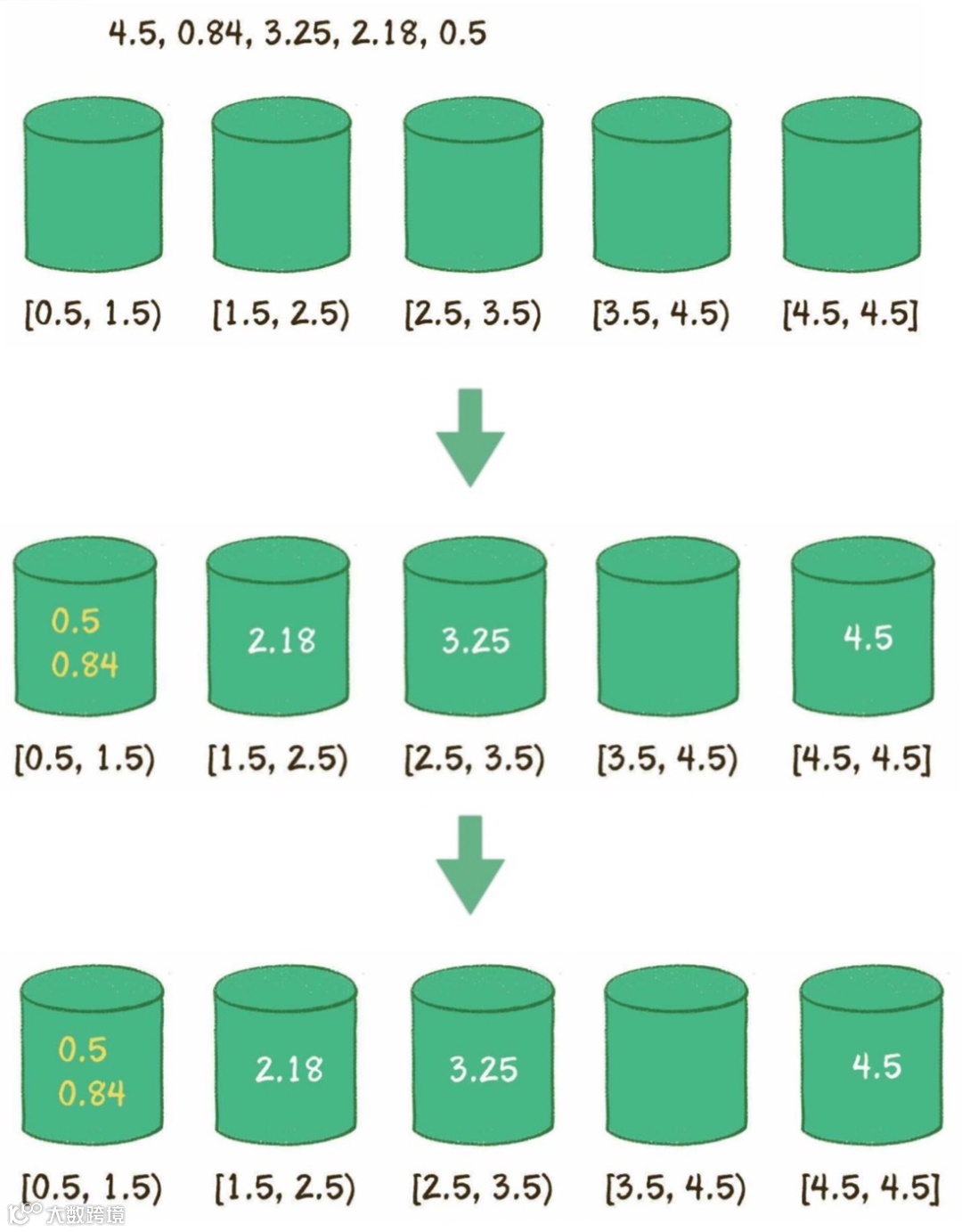 创建桶,区间跨度=(最大值-最小值)/(桶的数量-1)。
