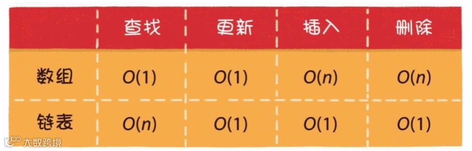读取O(n)、更新O(1)、插入O(1)、删除O(1)。