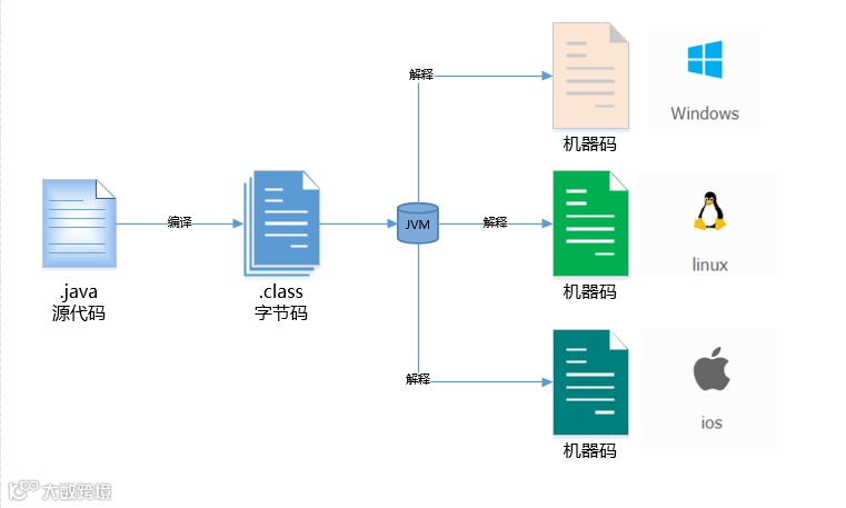 JVM:Java 虚拟机。它只认识 xxx.class 这种类型的文件,它能够将 class 文件中的字节码指令进行识别并针对不同操作系统向上的 API 完成动作。