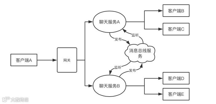 比如客户A发送一条聊天信息,被网关负载到聊天服务A了,这个时候,A并不会立刻将聊天信息转发到客户端B和客户端C,而是先将聊天信息发布到消息总线服务,这时聊天服务A和聊天服务B会监听到发布的聊天消息,这时聊天服务A和聊天服务B才将聊天信息转发到所有的客户端上面。