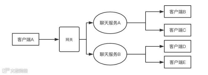 单服转发聊天信息 客户端A发送一条聊天信息,被网关负载到聊天服务A上面,由聊天服务A转发,那么客户端B和客户端C会收到消息,而客户端D和客户端E就收不到消息了。