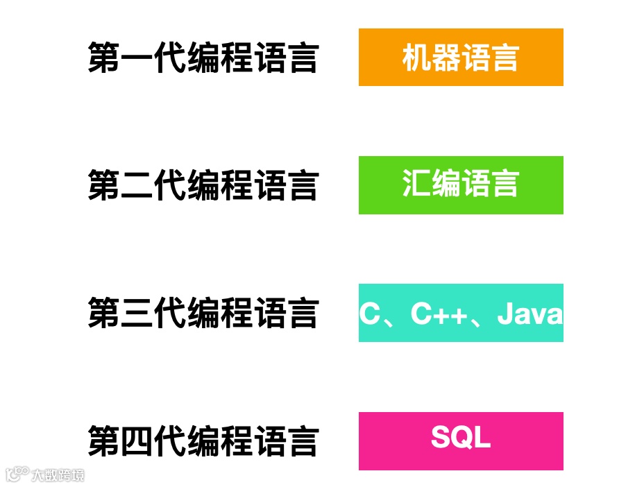 首先被开发出来的是 20 世纪 50 年代的汇编语言,5 年后发生了重要的进步,用于科学计算的 Fortran 被开发出来,用于商业处理的 Cobol 语言和用于符号计算的 Lisp 语言被开发出来;然后接下来的时间,慢慢很多编程语言被开发出来,比如 C、C++、Java、JavaScript、Python 等。后面还有用于数据处理的 SQL 语言。
