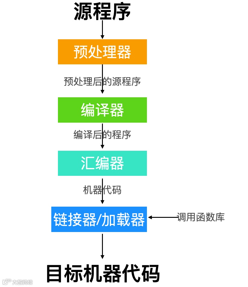 预处理器经过预处理后会作为输入传递给编译器,编译器对源程序进行编译,编译完成后生成汇编代码,作为汇编器的输入传递给汇编器,汇编器进行汇编处理转换为机器代码,注意这个时候还不是目标代码,还要经过链接器与系统库函数进行链接,最后由加载器把目标代码加载到内存中执行