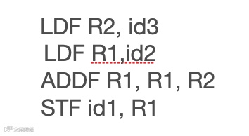 每个指令的第一个运算分量指定了一个目标地址,各个指令中的 F 告诉我们它处理的是 浮点数, 上面代码首先把 id3 装载进 R2 寄存器中,然后把 id2 装载进 R1 寄存器中,再对 R1 目标进行 R1 和 R2 寄存器相加的操作。最后把寄存器 R1 的值存放到 id1 的地址中。